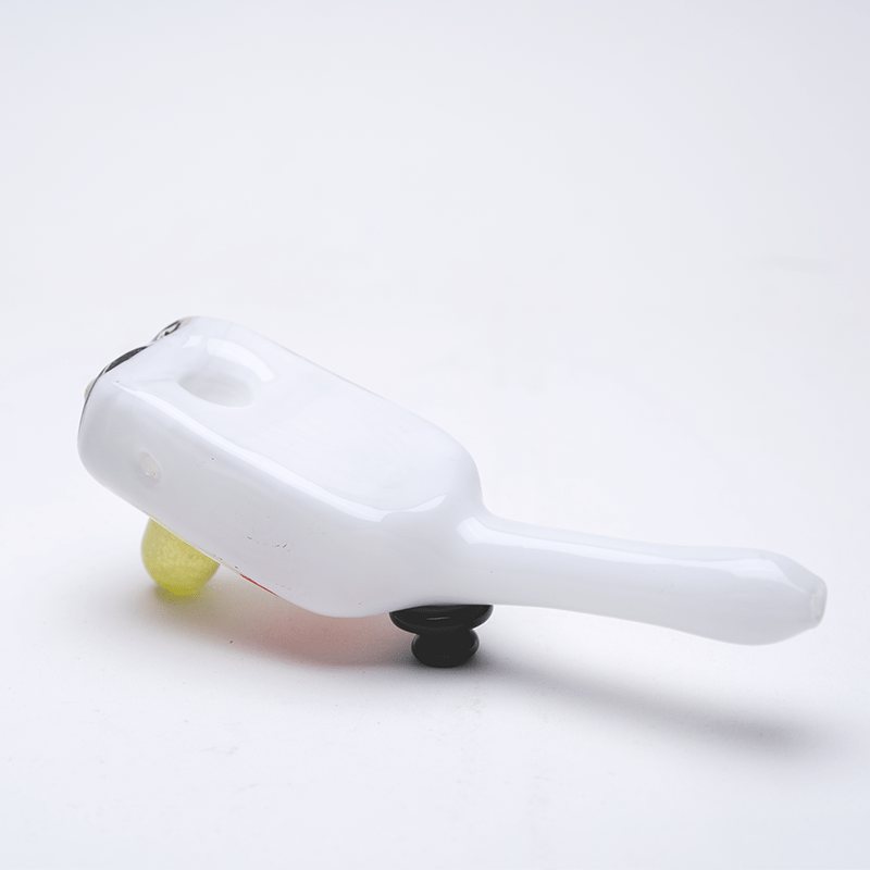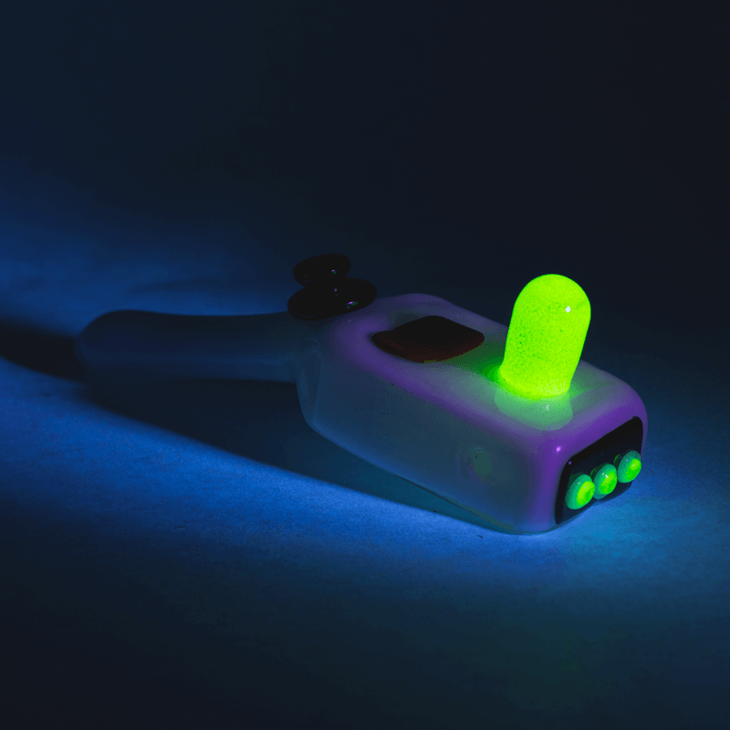 This glass pipe has UV Reactive Illuminati at its yellow parts making it glow when lit a the back. Pick up this Cartoon themed glass sculpture at the best price on the internet and prepare to get Schwifty!